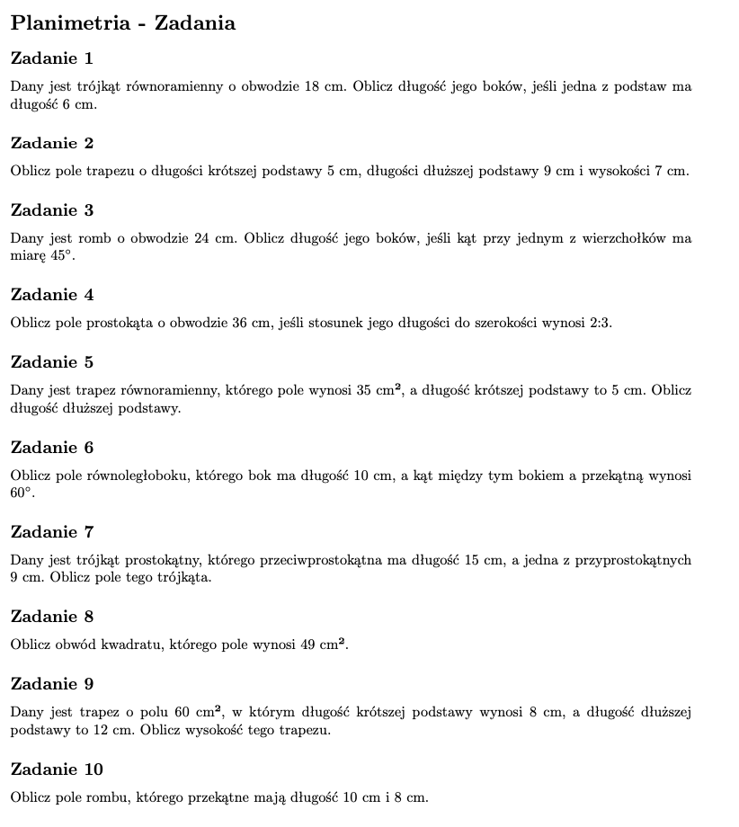 Wzory: W planimetrii stosuje się różne wzory, takie jak wzory na pole powierzchni i obwód różnych figur geometrycznych, w tym trójkątów, prostokątów, okręgów i innych.
